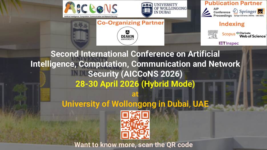 We are delighted to announce that the Second International Conference on Artificial Intelligence, Computation, Communication, and Network Security (AICCoNS 2026) (https://aiccons.com/) is inviting the original research papers and opportunity to host special session for its upcoming event. The conference will be held in a hybrid format on April 28–30, 2026, at the University of Wollongong in Dubai, UAE, in association with Deakin University, Australia.